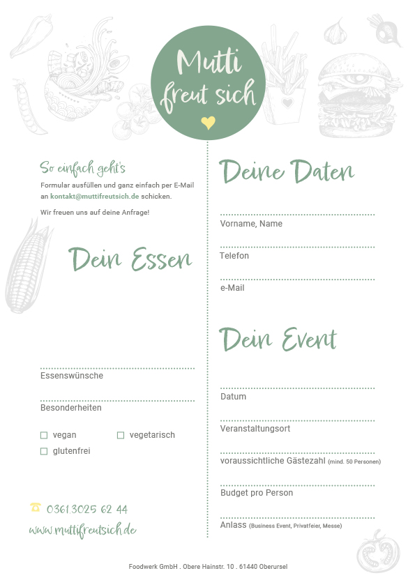 Mit unserem Foodtruck bringen wir die Gerichte von Mutti zu deinem Event. Ob Firmenveranstaltungen, Hochzeit, Geburtstagsfeier oder Fest aller Art – wir kommen gerne rund um Erfurt, Jena und Weimar vorbei und kochen dein Lieblingsgericht.